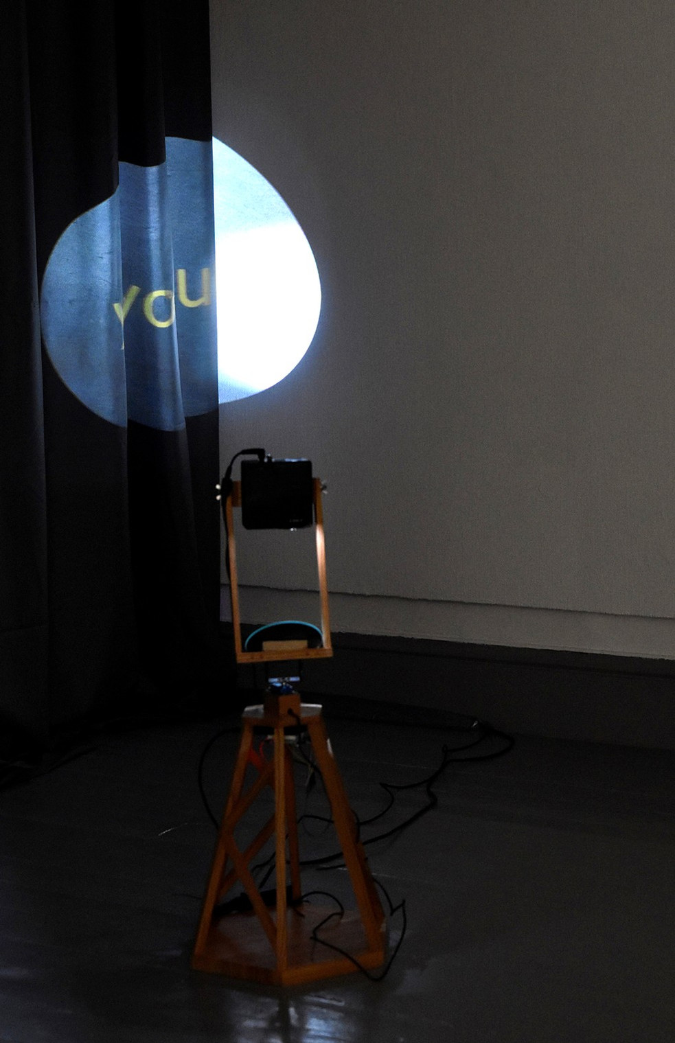 In this moving restless sculpture, the image creator and its distorter, the mirror, are locked together eye to eye. They work together to create a spotlight image that twitches and turns as it searches the room for answers from the adults around it.