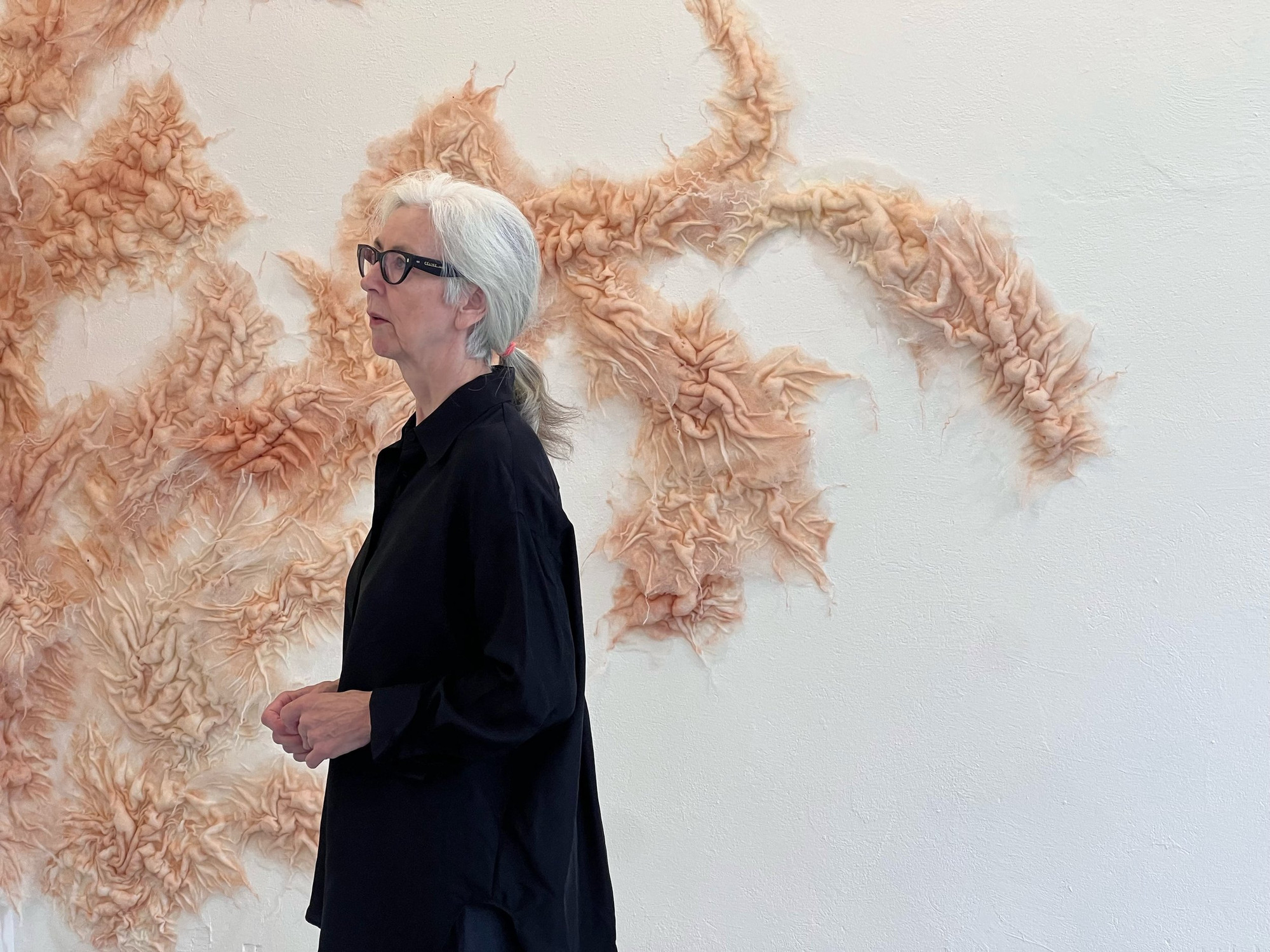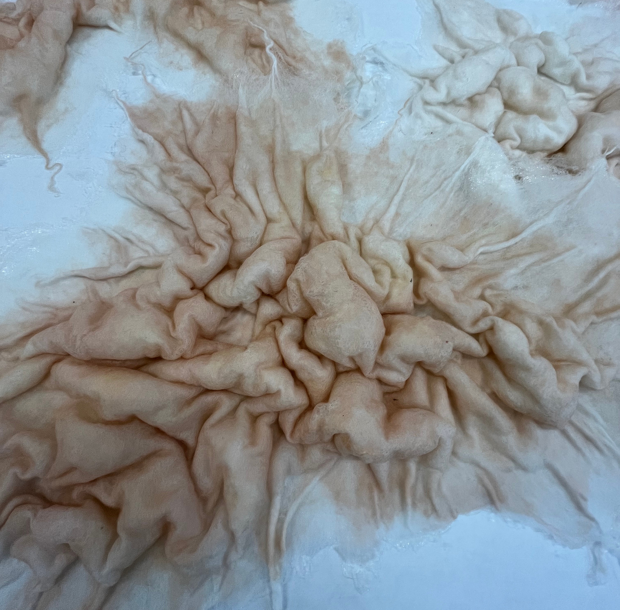 “I am looking for textiles and forms that convey shared memories and experiences, be it current political events or universal themes such as anxiety, loss, joy, death, the sea and love. I reuse textiles to preserve and promote female and feminine values. I work with wool fibers, self-made felt and reused textiles in 2- and 3-dimensional works, and often use glue so that the textiles become hard, even if the surfaces look and feel soft. I sew patches of homemade felt and old household textiles together into new shapes and patterns. Some of the wool fiber works are large flakes, while others consist of parts/modules.”