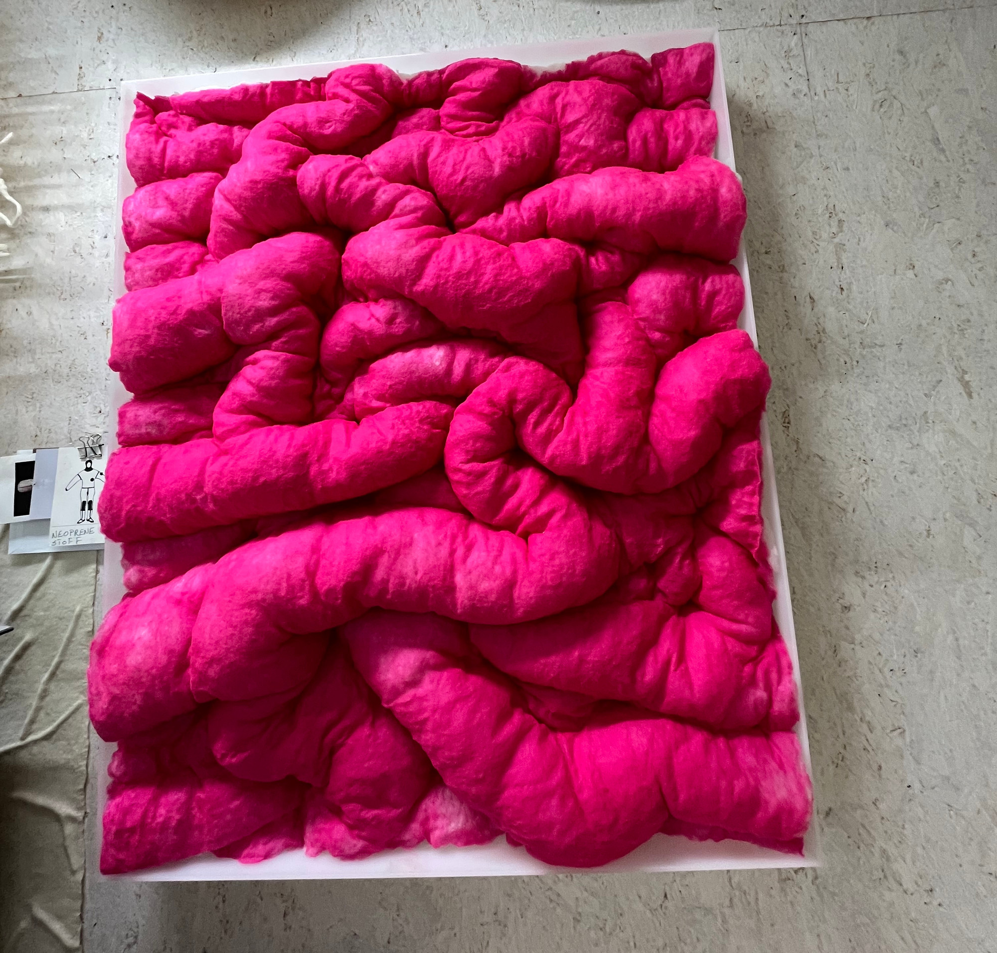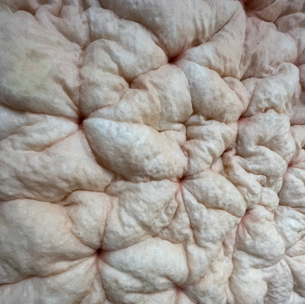 Helle Mellemstrand graduated from Bergen School of Arts & Crafts and she lives and works in Stavanger. Working in wool, glue and self-made felt Mellemstrand creates large scale installations and intricate work. The work could make ones thoughts wander towards wounds, crust, fat, brain, entrails or a delicious dessert.