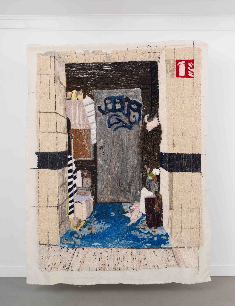 “Hand-knitted garments are a frequent point of departure in my art. In my latest work Rue de Fourcy, 2018, from the series: Does anyone know that you’re coming, threads from former installations with knitted clothes are unravelling and turned into a hand-tufted wool rug, a technique that often is used to make domestic mats and rugs.”