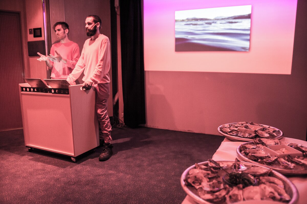 Lecture-performance aboard Hurtigruten with servings of oysters related to Cooking Sections water-cleaning oyster farms, and a closing lecture performance at Bergen Kunsthall combined with an artist talk and book launch with servings of seaweed cocktails.