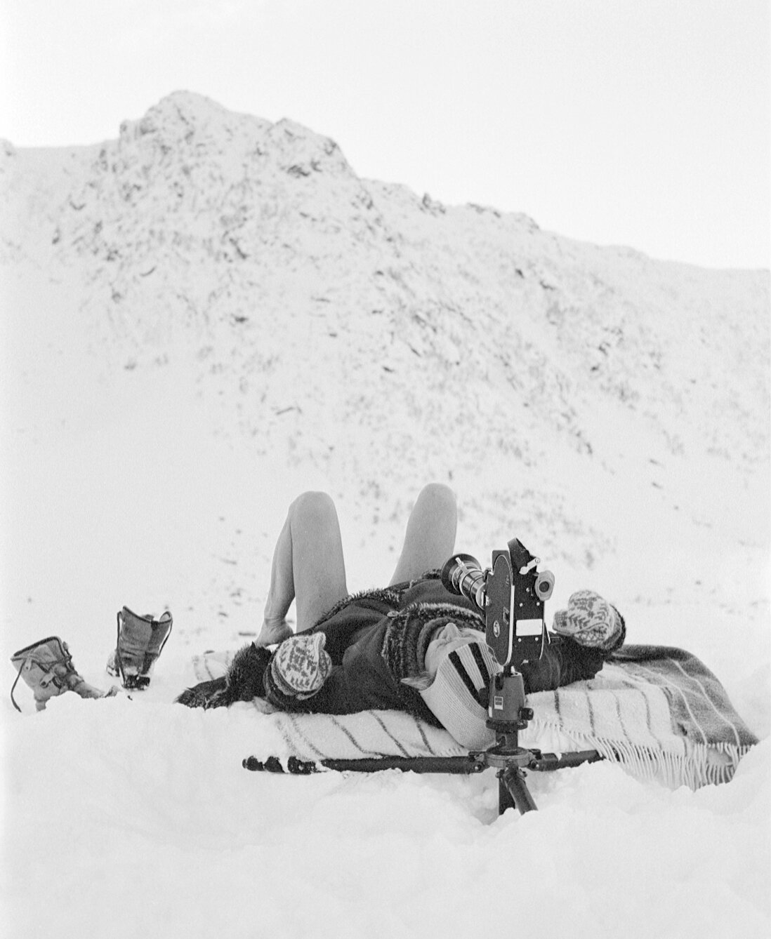 The film program is bracketed by when I discovered the end I wanted to live really long (digitised 16mm, 2013) by A K Dolven. Both opening and closing the film series, this work shows the artist performing in Vestvågøy, Lofoten, during the arctic winter. Captured by a 16mm camera positioned behind her, Dolven’s naked legs are alternating between spread and closed, literally framing and gendering the view of the majestic, erected mountain. Dolven’s quivering, tongue-in-cheek gesture plays with stereotypical myths of “mother nature” while confronting her own freezing body with the dramatic Norwegian scenery.